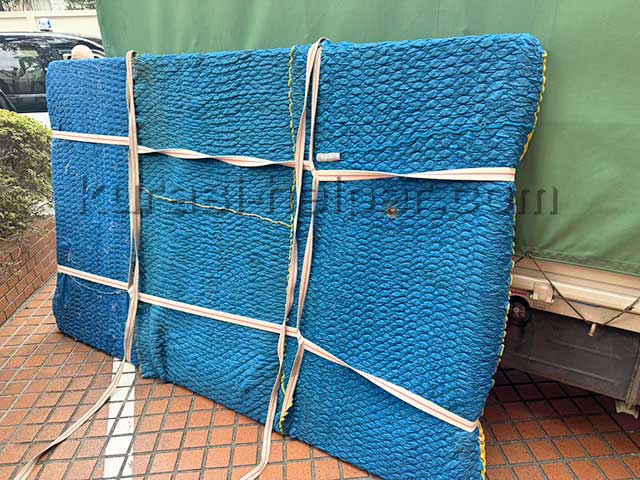 しっかり梱包しバランスが取れるようベルトをかけて吊り上げます