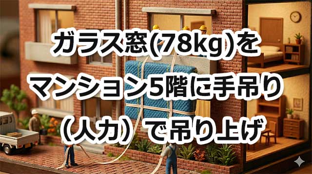 今回ご紹介するのはリフォームのため必要になったガラス窓の搬入です。大きなガラス窓なので重く、78kgありました。搬入先はマンションの5階です。