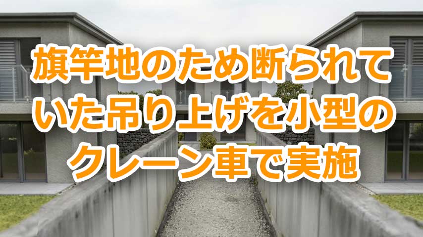 旗竿地とは、接道している敷地が細い通路のようになっている土地のことです。この細い通路をクレーン車が通れないことが問題でした。